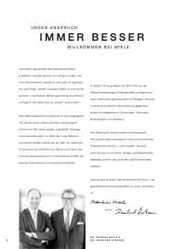 In diesem Sinne gilt Miele seit 1899 nicht nur als Inbegriff erstklassiger Produktqualität und Ingenieurs- kunst. Miele steht gleichermaßen für Respekt, Fairness und partnerschaftliche Wertschätzung gegenüber seinen Vertriebspartnern, Endkunden, Lieferanten, Beschäftigten und Nachbarn.
